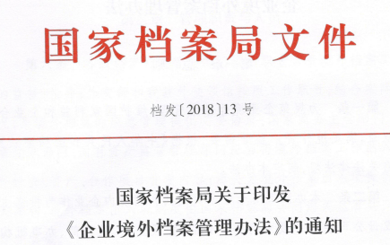 国家档案局正式印发《企业境外档案管理办法》并发出通知要求各境外单位遵照执行 。涉及企业资产与产权、商业秘密、债权债务、证书、公文、会计等内容的档案被列为境外企业重要档案,应当符合……...